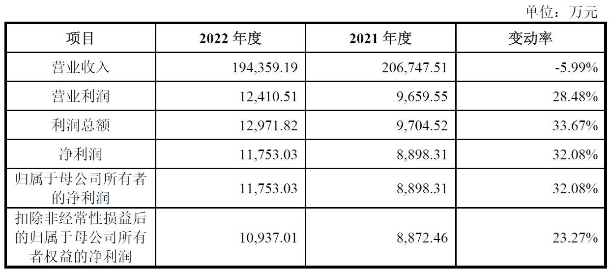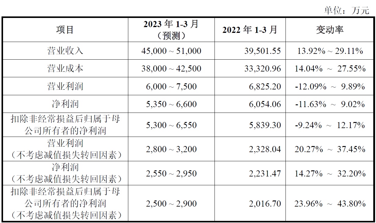 公司预计2023年1-3月实现营业收入45,000万元至51,000万元,变动率为13.92%至29.11%;预计净利润5,350万元至6,600万元,变动率为-11.63%至9.02%;预计扣除非经常损益后归属于母公司所有者的净利润为5,300万元至6,550万元,变动率为-9.24%至12.17%。