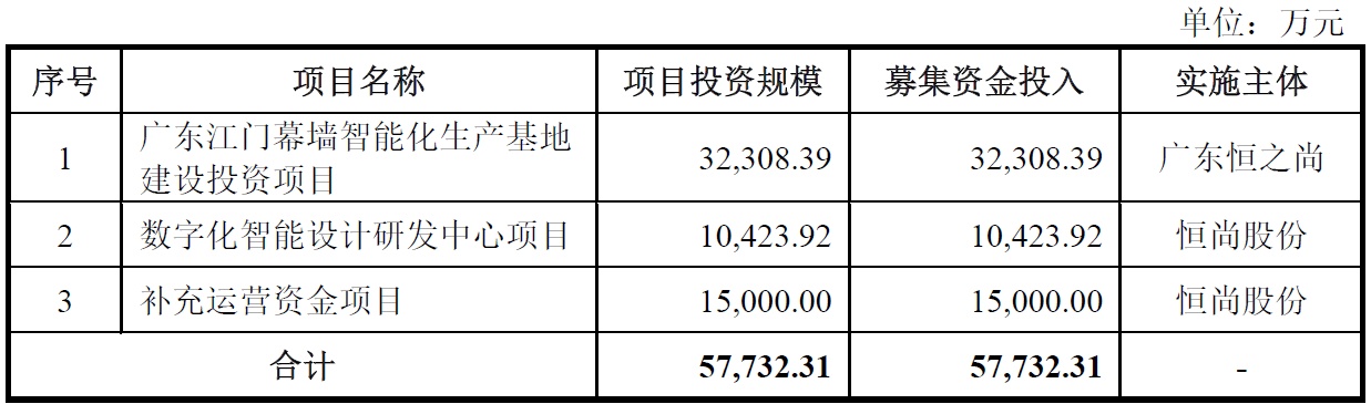 恒尚节能本次发行募集资金总额51,940.00万元,扣除发行费用后募集资金净额为46,058.01万元。公司本次募集资金净额较原计划少11,674.3万元。恒尚节能2023年4月12日发布的招股说明书显示,公司拟募集资金57,732.31万元,用于广东江门幕墙智能化生产基地建设投资项目、数字化智能设计研发中心项目、补充运营资金项目。