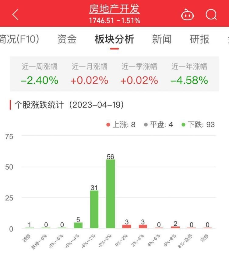 中国经济网北京4月19日讯 今日,房地产开发板块整体跌幅1.51%,其中8只股票上涨,4只股票平盘,93只股票下跌。