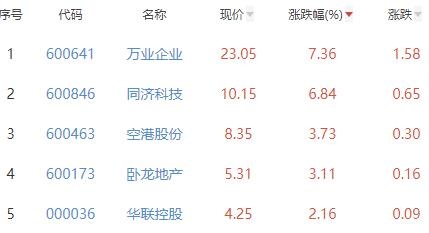 其中,万业企业、同济科技、空港股份、卧龙地产、华联控股位列板块涨幅前五位,涨幅分别为7.36%、6.84%、3.73%、3.11%、2.16%。