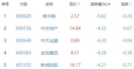 新华联、中交地产、中天金融、金地集团、新城控股位列涨幅榜后五位,涨幅分别为-9.82%、-4.32%、-4.30%、-4.28%和-4.21%。