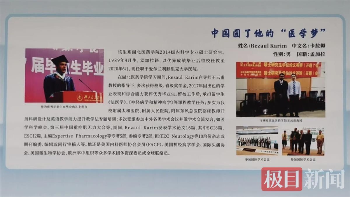 4月18日,极目新闻记者从湖北医药学院获悉,由中国高等教育学会主办的第58·59届中国高等教育博览会近日在重庆举行,本届高博会特别推出“优秀来华留学生成果展”,湖北医药学院选送的来华留学生校友Rezaul Karim事迹材料《中国圆了他的“医学梦”》从全国近70所高校推荐的百余份素材中脱颖而出,在现场显著位置展示。