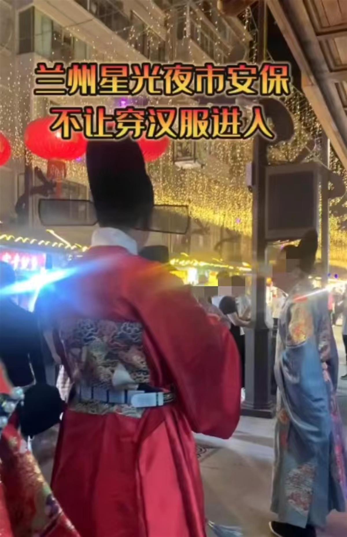 近日,有甘肃兰州市民发视频称,兰州大众巷新光夜市保安禁止穿汉服的人进入夜市。4月19日,当事市民表示,双方就此事就吵了起来,他们认为汉服不应该被另眼相看。夜市运营方负责人回应称这是误会,保安误以为一行人是到夜市进行低俗直播,才拦住了他们。