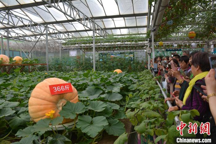 图为民众参观菜博会上的巨型南瓜。 吕妍 摄