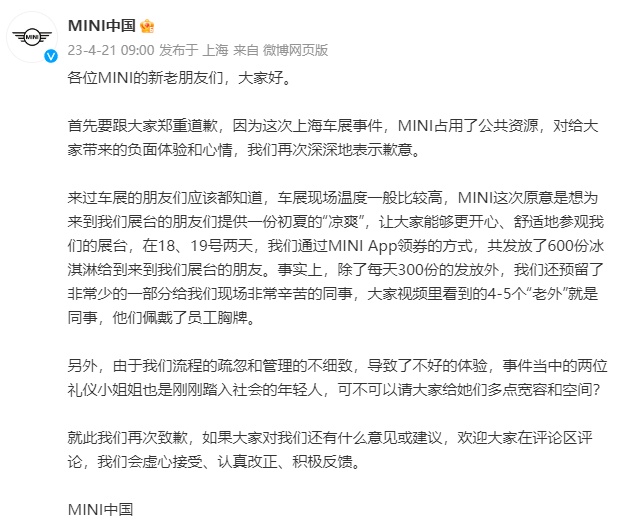 首先要跟大家郑重道歉,因为这次上海车展事件,MINI占用了公共资源,对给大家带来的负面体验和心情,我们再次深深地表示歉意。