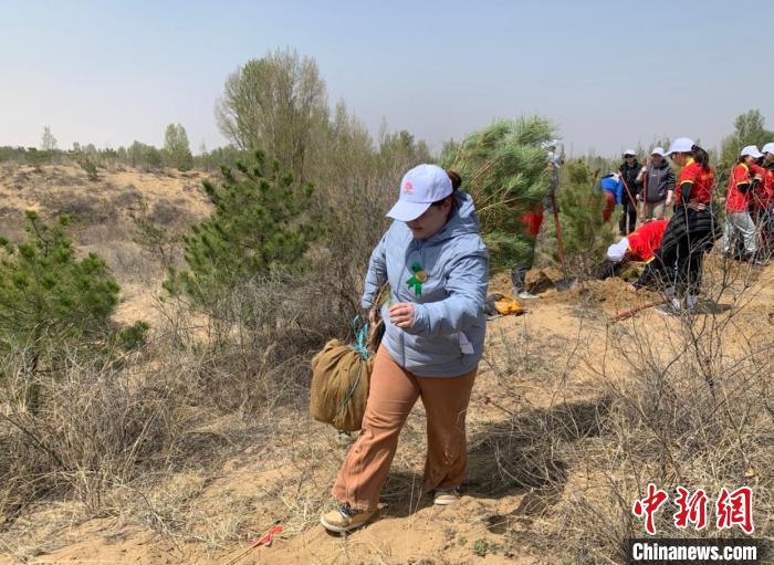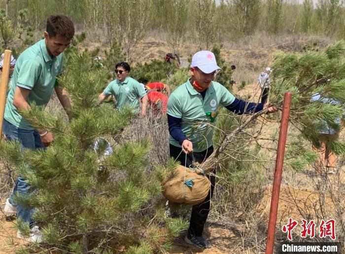 中新网鄂尔多斯4月22日电 (奥蓝)22日,在鄂尔多斯市举办的“同植一片绿共育友好情”——来华留学生植树活动上,来自蒙古国、俄罗斯、巴基斯坦、哈萨克斯坦等14个国家的数十名来华留学生,在库布其沙漠深处再添百株新绿。
