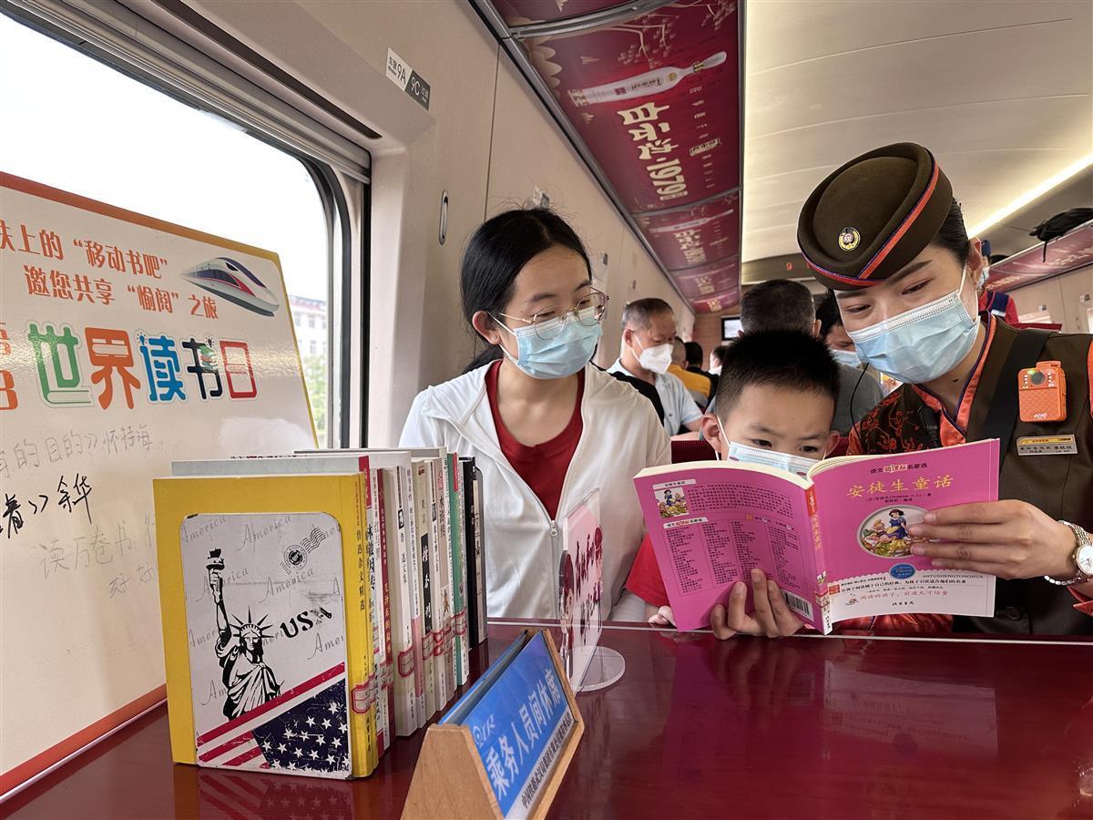 由襄阳东开往上海虹桥的G1770次列车上,新开设的“移动书吧”吸引了不少旅客的目光。乘客王女士说,此次乘车是想错峰带孩子提前五一旅游。乘务员高梦婷在书籍中精心挑选了一本《安徒生童话》,为小男孩讲了一则《卖火柴的小女孩》的故事,小男孩听得十分认真。