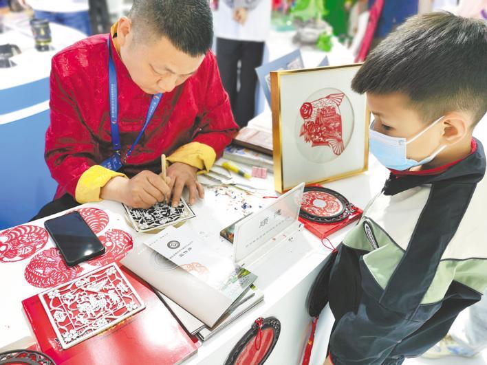 在江西馆,6岁的小米走近剪纸展台,将画板上的兔子展示给瑞昌剪纸非遗传承人邵晴看。邵晴心领神会,将红纸折叠几下,手指带动剪刀上下翻飞,不一会儿,一只可爱的长耳兔制作完成。将长耳兔小心翼翼地放进袋子里,小米心满意足地抱着画板离开了。