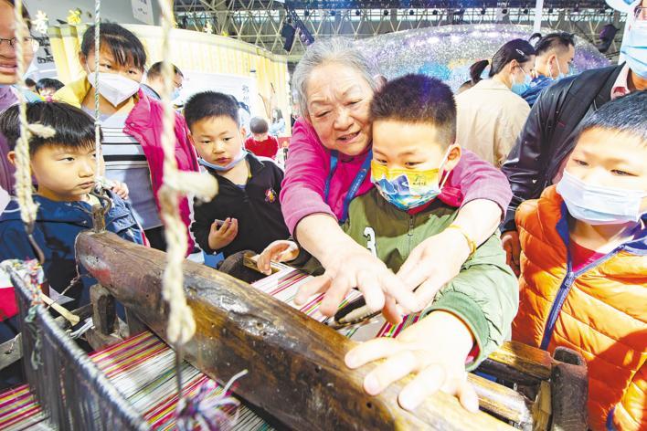 非遗传承人在鄂州馆带孩子体验华容土布纺织工艺。 (湖北日报全媒记者 何宇欣 摄)