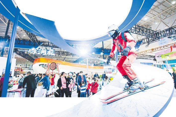 游客在辽宁馆体验冰雪运动装备。(湖北日报全媒记者 何宇欣 摄)