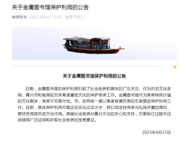 中新网4月23日电 近期,金庸图书馆的保护利用引发关注。浙江省嘉兴市南湖区人民政府今日通过微信公众号发布公告称,作为历史文化名城,嘉兴市和南湖区历来高度重视文化的保护传承工作。金庸图书馆作为具有特殊价值的文化载体,有其不可替代性。市、区两级一直以高度审慎负责的态度推进保护利用工作。目前,具体保护利用方案正在优化论证之中,南湖区将坚持传承与弘扬并重的原则,更好发挥其历史文化作用。感谢社会各界对嘉兴文化的关心和支持,方案制订过程中还将继续广泛征询和听取社会各界的宝贵意见。