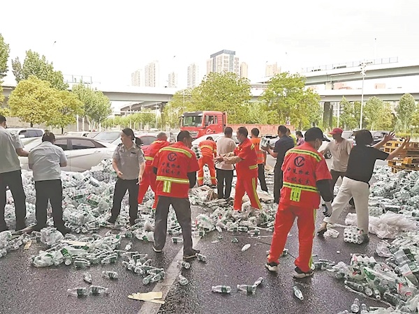 在现场,交警部门负责外围保障,维持现场车辆秩序,城管队员与环卫工肩扛手搬,紧急清运散落在地的矿泉水。约一小时后,金山大道海口转盘处道路交通基本恢复畅通。