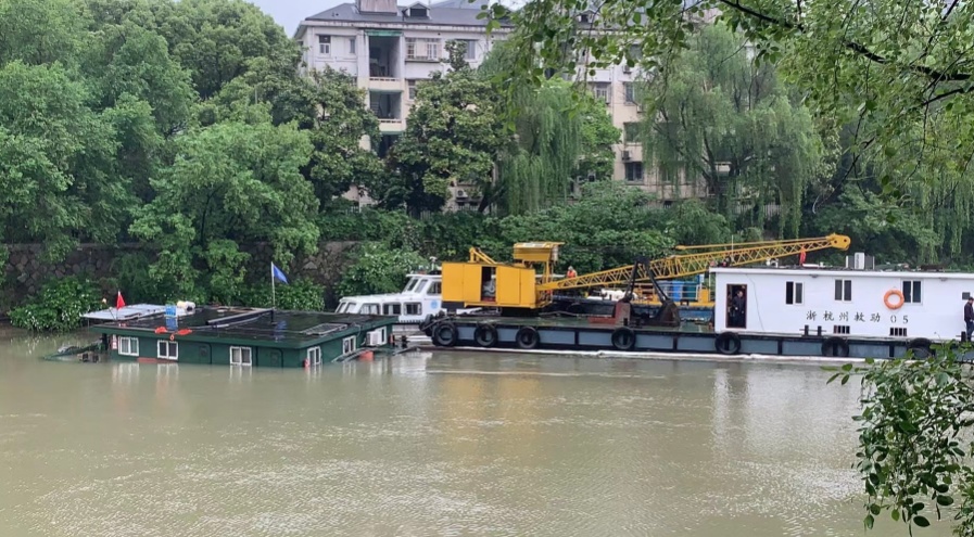 杭州市交通运输行政执法队在事故发生后,立即发布航行警告,开展临时交通管制,指挥滞留船舶有序停靠,协调打捞船、卸载船等赶赴事故现场开展救援,现场已做好相关防污染措施。
