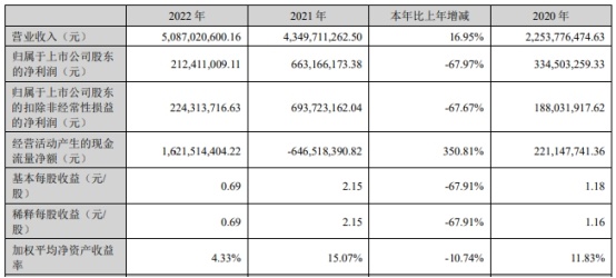 中国经济网北京4月24日讯 寒锐钴业(300618.SZ)上周五晚间披露的2022年年度报告显示,公司去年营业收入为50.87亿元,同比增长16.95%;归属于母公司所有者的净利润为2.12亿元,同比下降67.97%;归属于上市公司股东的扣除非经常性损益的净利润2.24亿元,同比下降67.67%;经营活动产生的现金流量净额16.22亿元,同比增长350.81%;加权平均净资产收益率4.33%,同比下降10.74个百分点。