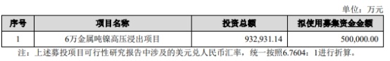 寒锐钴业一同披露的2023年度向特定对象发行A股股票预案(修订稿)显示,公司本次发行计划募集资金总额不超过500,000.00万元(含本数)。扣除发行费用后的募集资金净额将用于投资以下项目:6万金属吨镍高压浸出项目。截至预案公告日,公司尚未确定本次发行的发行对象。