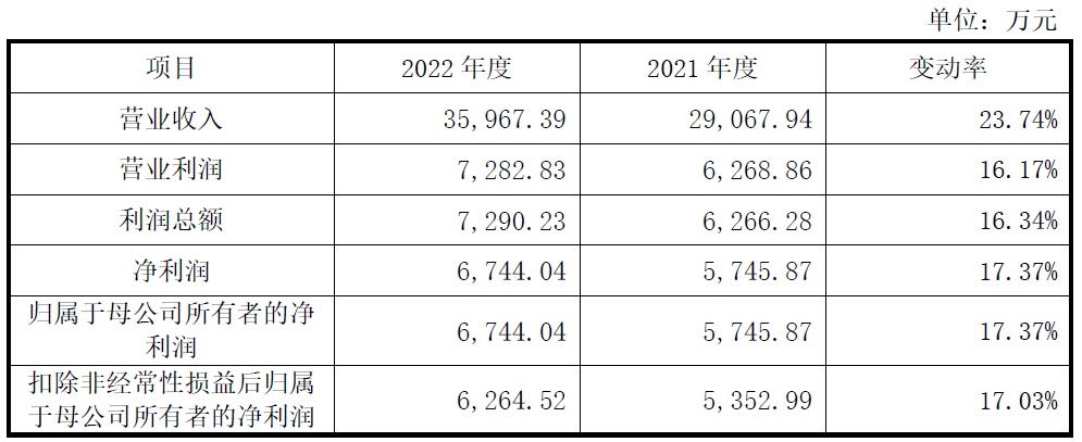 2022年全年,荣旗科技营业收入为35,967.39万元,同比增长23.74%;净利润为6,744.04万元,同比增长17.37%;归属于母公司所有者的净利润为6,744.04万元,同比增长17.37%;扣除非经常性损益后归属于母公司所有者的净利润6,264.52万元,同比增长17.03%;经营活动产生的现金流量净额9,578.70万元,同比变动率12160.08%。