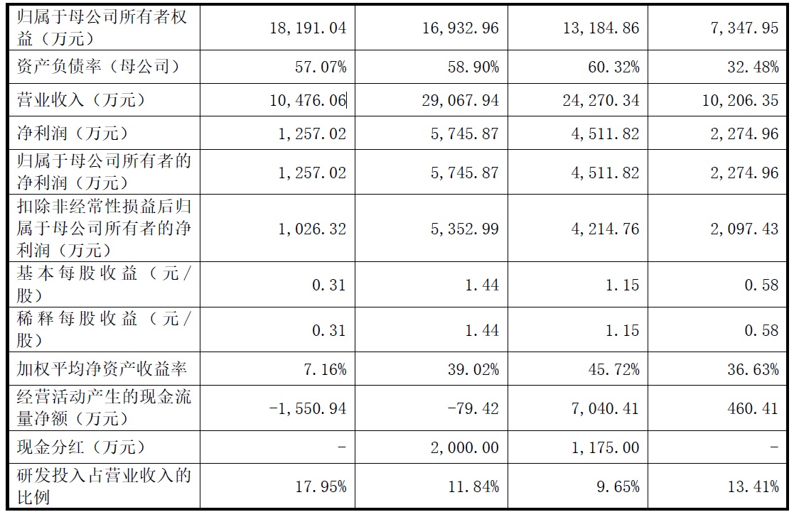2019年至2022年1-6月,荣旗科技的营业收入分别为10,206.35万元、24,270.34万元、29,067.94万元和10,476.06万元;净利润/归属于母公司所有者的净利润分别为2,274.96万元、4,511.82万元、5,745.87万元和1,257.02万元;扣除非经常性损益后归属于母公司所有者的净利润分别为2,097.43万元、4,214.76万元、5,352.99万元和1,026.32万元。