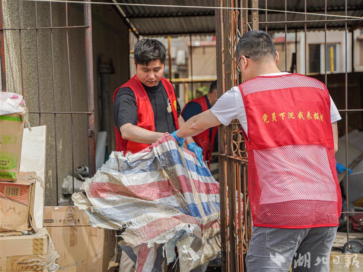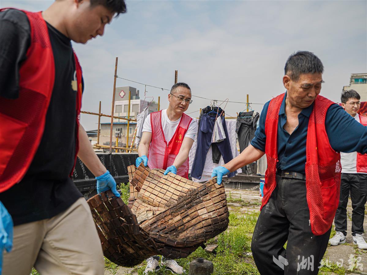 在荣华街道的荣华社区,由社区居民志愿者、街辖各单位机关党员干部组成的劳动大军,爬楼攀顶,对社区内4栋8层高无电梯的老旧住宅楼顶的居民堆放杂物进行清理,用“击鼓传花”的方式,将杂物从楼顶移至楼下。