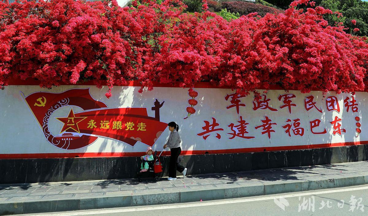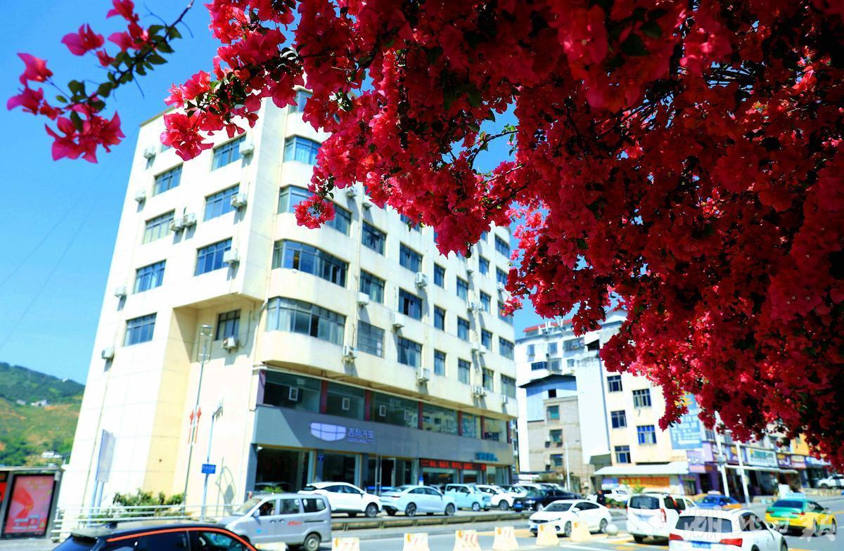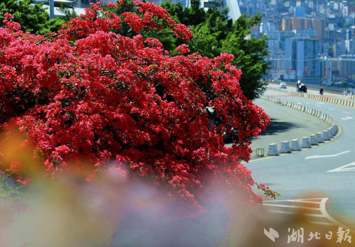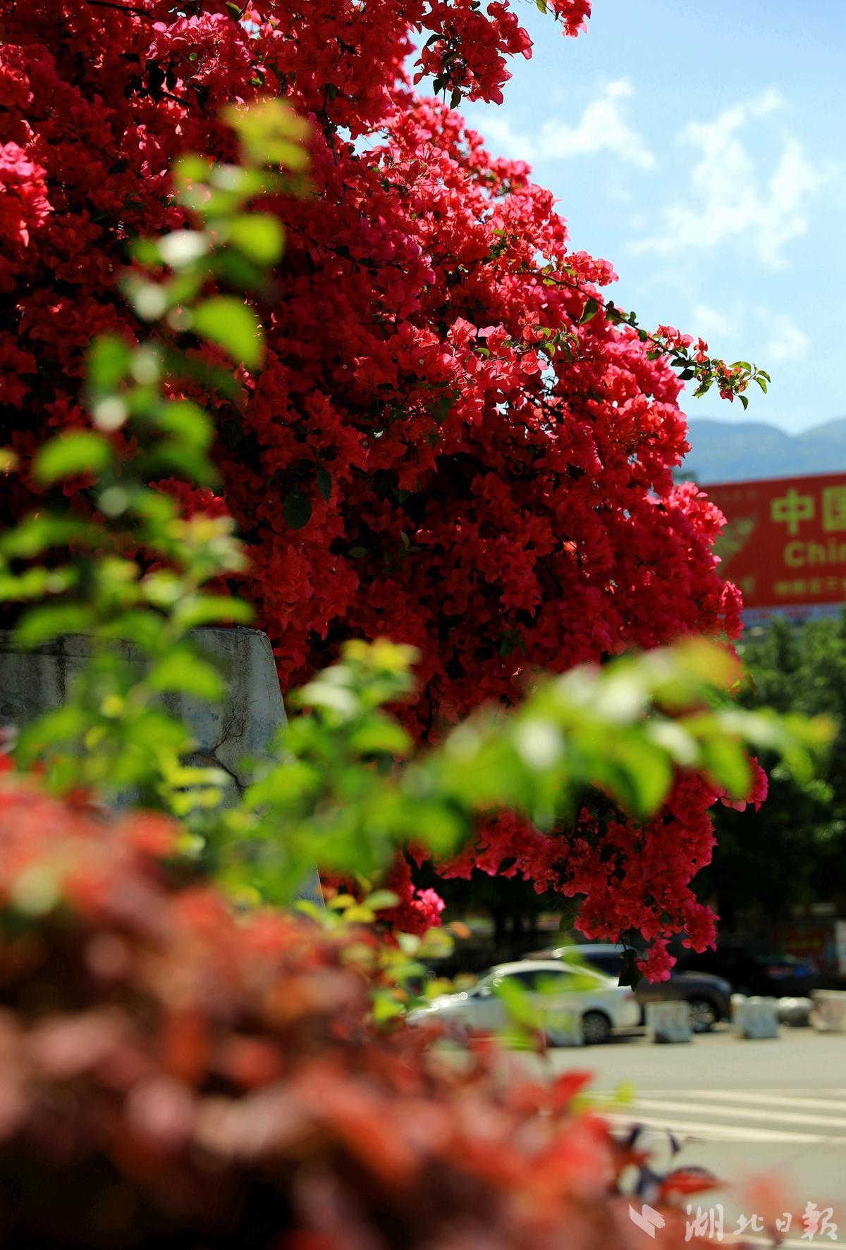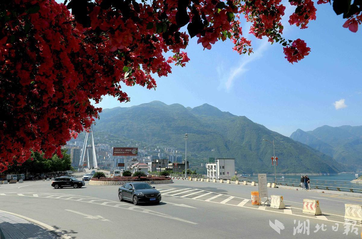 4月26日,巴东县官渡口镇五里堆社区怒放的三角梅,同蓝天白云、三峡平湖构成一幅美丽的图画。