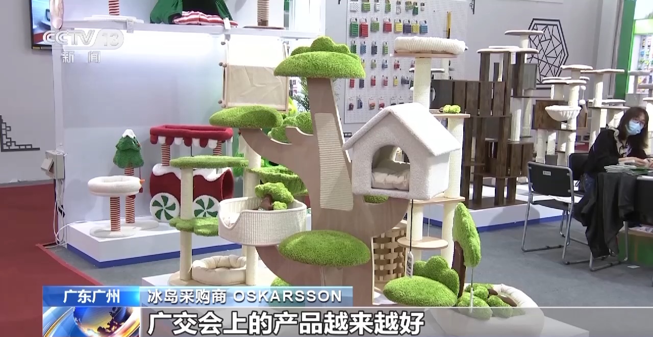 广东台记者 黄子懿:我现在在广交会二期展馆的园林和宠物用品展区,这里非常的热闹,如果用“硬核”和“科技”来形容一期,用“丰富多彩”形容二期可能就更加合适了。在这里我们看到为宠物专门定制的爬架、家具、户外用品,甚至一个小小的随行杯都有几十种款式。同时我们还看到不少企业的展位上都挂了欢迎境内采购商参观的牌子,因为这一届增加了境内采购商的席位,所以说不少的境内采购商都到会来咨询。