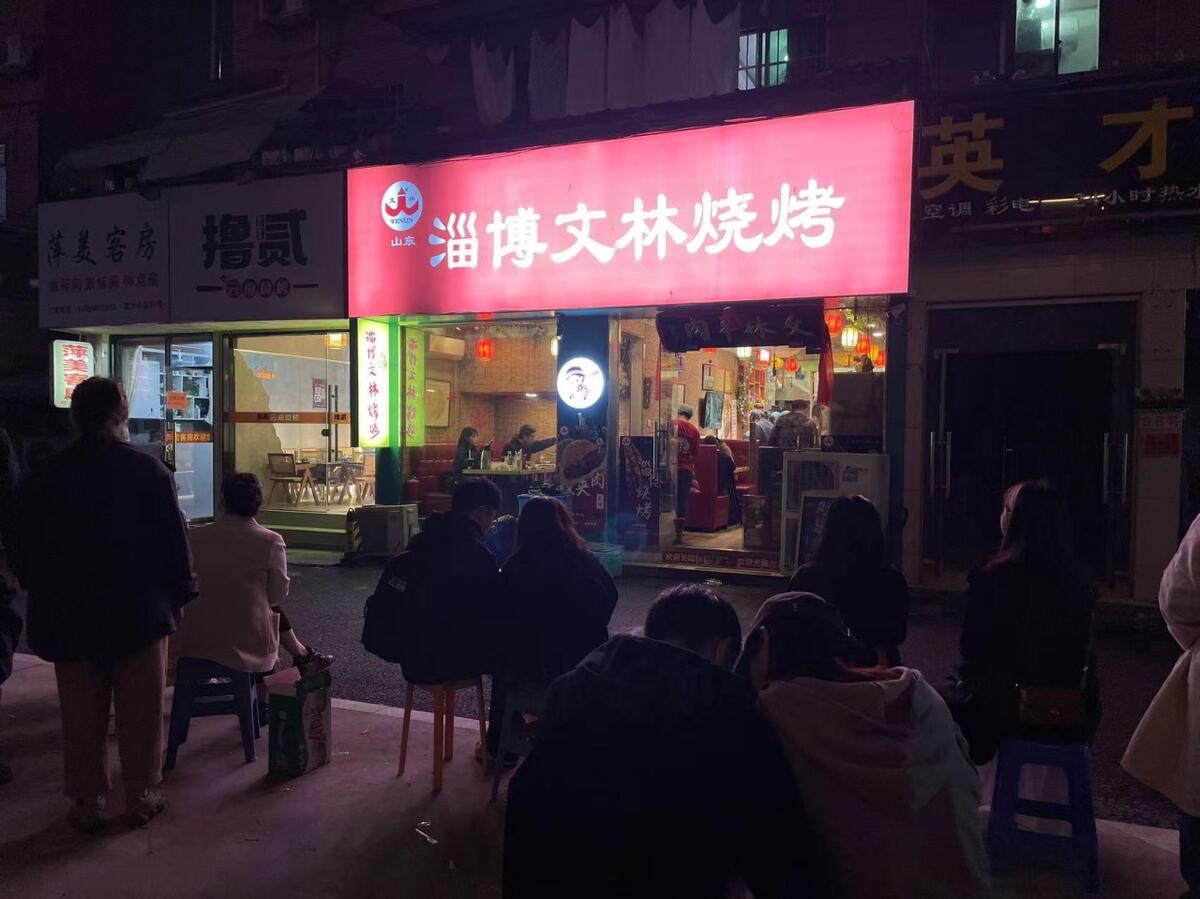 火起来的不止吕子悦一家,在商业街后面的一排店铺里,一家红色招牌上写有“淄博文林烧烤”的烧烤店尤为显眼。晚上9点多,店铺门口仍然排着长队,顾客们一边喝着免费提供的AD钙奶,一边翘首等待着叫号。