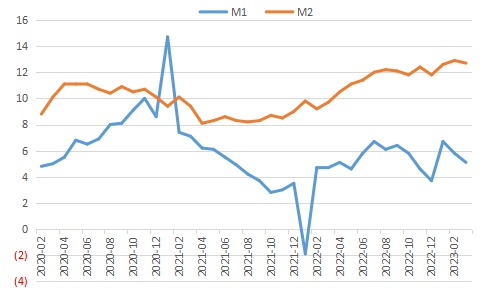 图3:2020-2022年3月中国的M1和M2同比增长情况。数据来源:国家统计局、中国人民银行、WIND