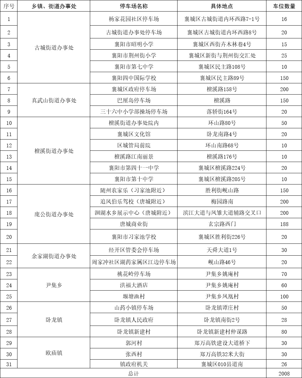广大游客朋友:2023年“五一”小长假即将来临,襄城区将迎来旅游高峰,为有效缓解停车难,方便广大游客出行,营造良好的旅游和交通环境,树立襄城宜居、宜业、宜游的城市形象,经研究决定,按照能放则放、应放尽放的原则,自2023年4月29日0时-5月3日24时,襄城区党政机关、学校等单位内部停车场(泊位)将免费对外开放。此次免费开放的停车场(泊位)涉及襄城区党政机关、事业单位、社区、学校等31个点位,合计约2008个停车位(具体点位详见附表)。请各位车主遵守停车秩序,规范停车,爱护环境,共建文明襄城。