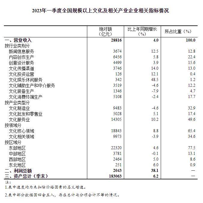央视网消息:据国家统计局,据对全国7.1万家规模以上文化及相关产业企业(以下简称“文化企业”)调查,2023年一季度,文化企业实现营业收入28816亿元,按可比口径计算,比上年同期增长4.0%。其中,文化新业态特征较为明显的16个行业小类实现营业收入10961亿元,比上年同期增长11.1%,快于全部规模以上文化企业7.1个百分点。