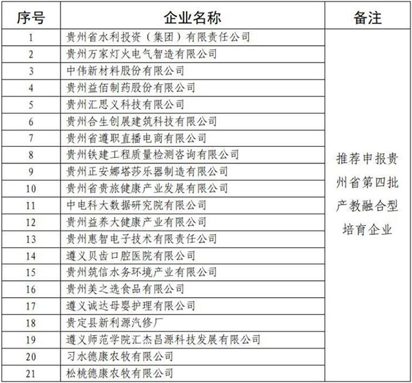 4月28日,记者从贵州省发展和改革委员会获悉,经企业自愿申报、部门审核、专家评估,省发展改革委确定21家企业为贵州省第四批产教融合型培育企业,现予公示。(记者 吴蔚)