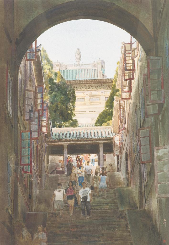 中国美术学院教授、中国美术家协会水彩画艺委会主任陈坚的《武大樱花》落英缤纷、如梦似幻;湖北美术学院教授、湖北水彩画代表人物之一刘寿祥笔下的武大老斋舍优雅古朴;武汉美术馆馆长陈勇劲的水彩作品《上午的工学院》带有鲜明的个人艺术风格特点,单色的背景下,红色作为画面的底色,让工学楼建筑显得庄重优美。