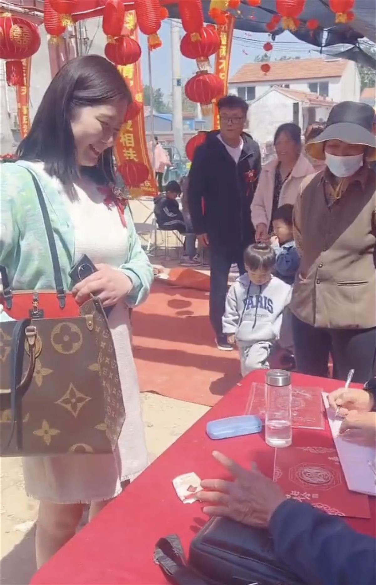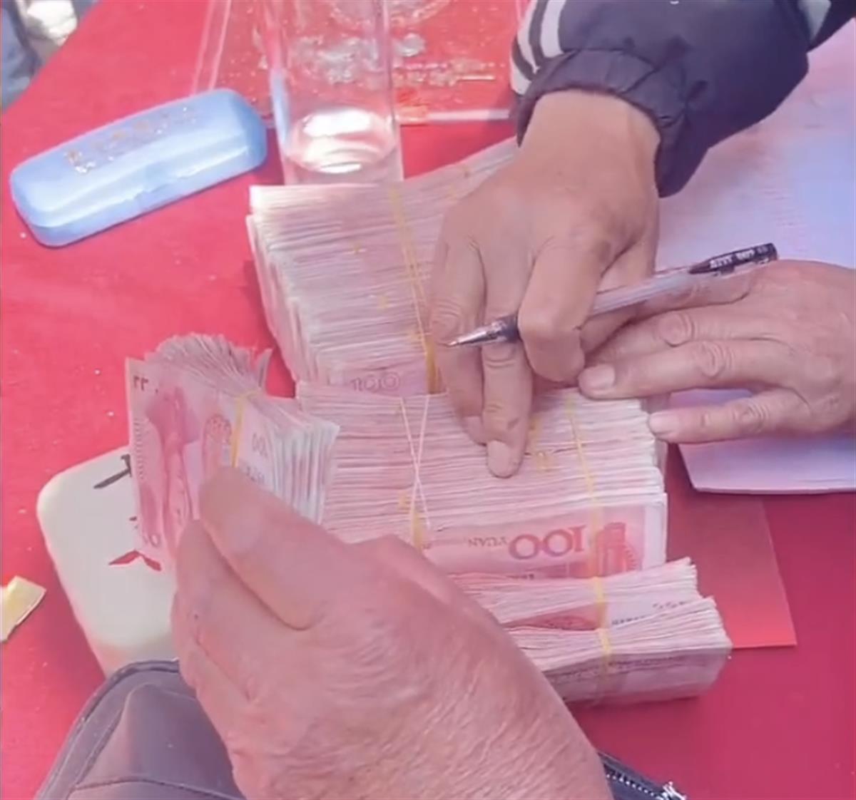 视频显示,在一个农村婚礼的现场,一名女子挎着肩包开心地来到礼金记账处,她从包中拿出两大捆现金,引来一众人围观。