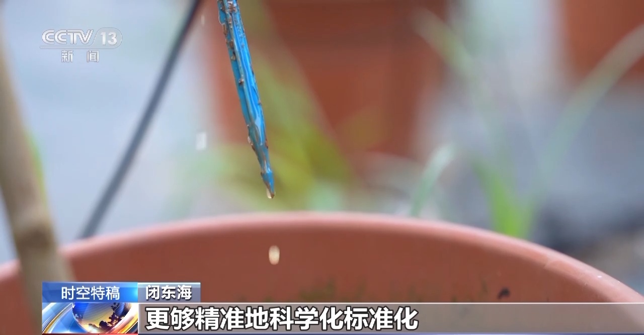 闭东海:我们这里面布有很多管,这就是我们水肥一体化的理念。通过这样小小的一根滴箭,能够精准地科学化、标准化把水和肥料输送到这盆茉莉花里面,不像以前我们传统的喷灌,很浪费。