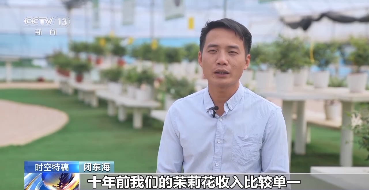 闭东海:十年前我们的茉莉花收入比较单一,就是采花卖花来窨制茉莉花茶,这个价格受波动很厉害。一开始我们横州的茉莉花盆栽都是外地老板来到我们这里发展,我们只赚取种植花苗的辛苦费。我就想为什么不能我们自己做自己的茉莉花盆栽,为什么做不了自己的品牌,所以我决定返乡创业,让我们的花农更受益。