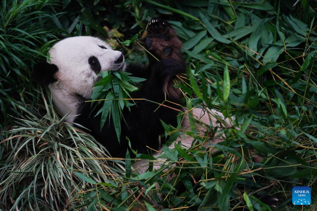 After the caretakers cleaned the space and put in the bamboo breakfast, Lele and Yingying came out from the dormitory at around 10:00 a.m. and began enjoying the first of their four daily meals.(Xinhua/Wang Shen)