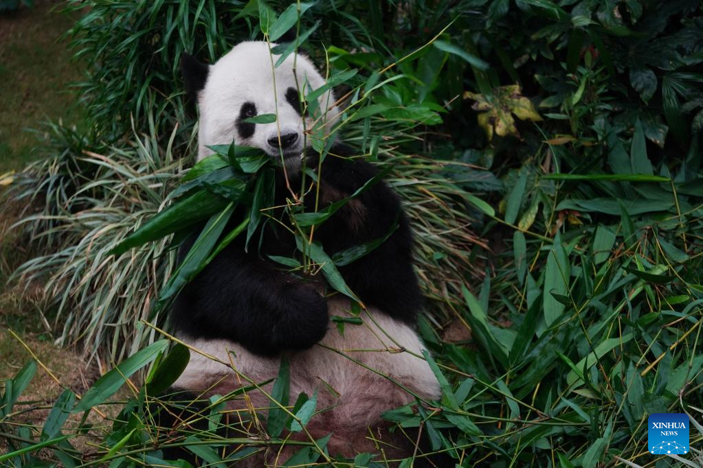 Giant panda Lele eats bamboos at Ocean Park Hong Kong, south China's Hong Kong, April 19, 2023. On a spring morning, Hong Kong Observatory issued a rainstorm alert.