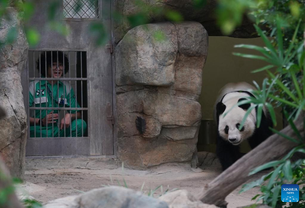 Caretaker Leung Galeun observes the health condition of giant panda Yingying at Ocean Park Hong Kong, south China's Hong Kong, April 19, 2023. On a spring morning, Hong Kong Observatory issued a rainstorm alert.