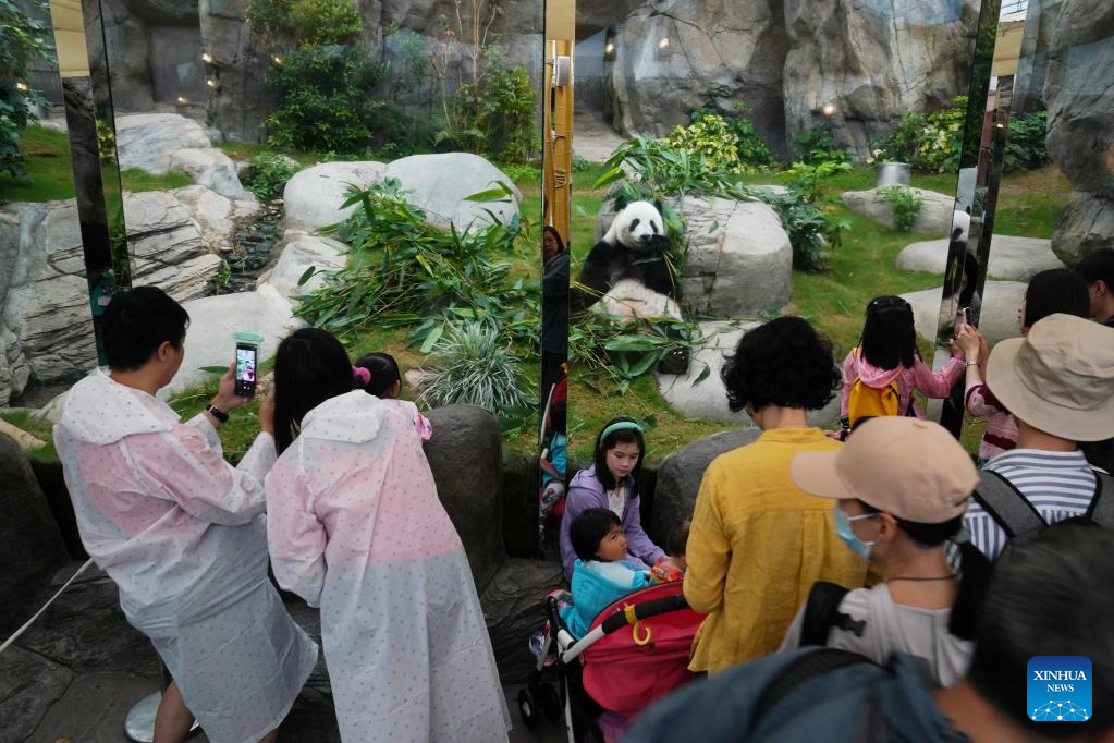 Tourists take photos of giant panda Yingying at Ocean Park Hong Kong, south China's Hong Kong, April 19, 2023. On a spring morning, Hong Kong Observatory issued a rainstorm alert.