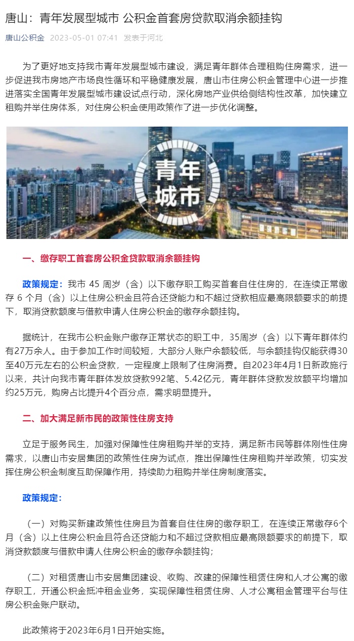 央视网消息:据“唐山公积金”微信公众号5月1日消息,唐山市住房公积金管理中心对住房公积金使用政策作了进一步优化调整。其中提出,缴存职工首套房公积金贷款取消余额挂钩。政策规定:唐山市45周岁(含)以下缴存职工购买首套自住住房的,在连续正常缴存6个月(含)以上住房公积金且符合还贷能力和不超过贷款相应最高限额要求的前提下,取消贷款额度与借款申请人住房公积金的缴存余额挂钩。