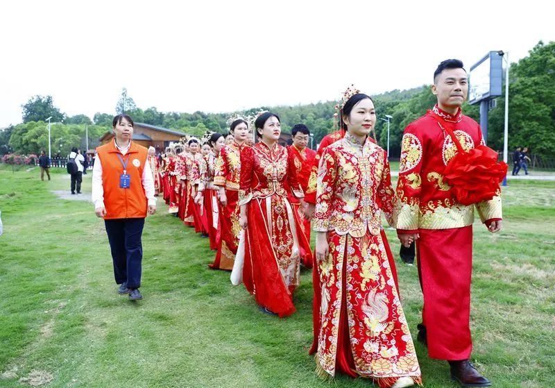在活动启动仪式良辰·吉时环节中,10对新人跨喜门,行婚姻之礼、结百年之好、立海誓山盟,在众人的见证下,举行了一场充满传统仪式感的婚礼。近年来月亮湖景区一直是我县举办相亲活动、集体婚礼的重要场地,这次生态旅游季的启动,意味着黄山头镇的婚恋特色小镇品牌已进一步打响,成为独具特色的旅游名片。