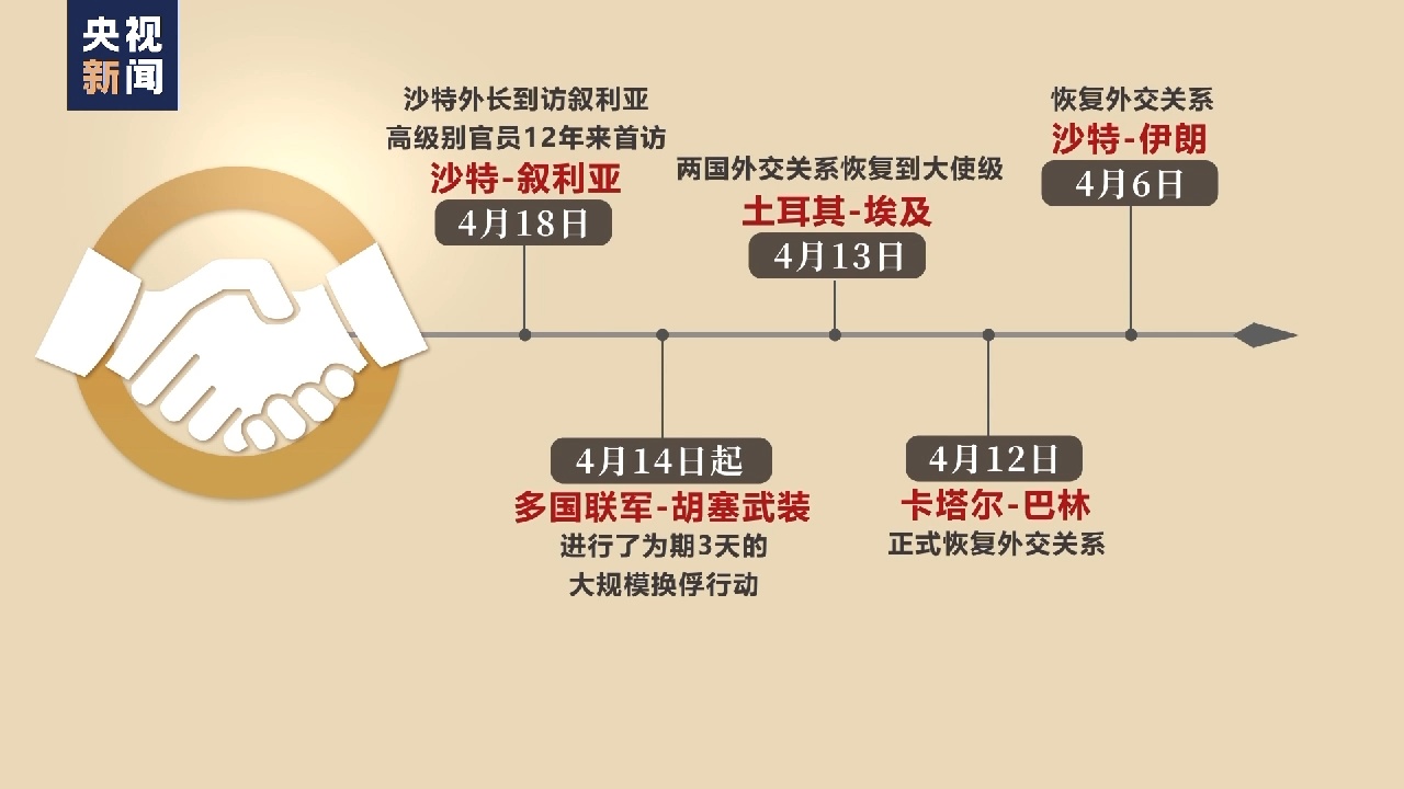 近期,中东地区长期以来的紧张局势呈现持续缓和势头,多国走向和解。4月18日,沙特外长到访叙利亚,这是沙特政府高级别官员12年来首访叙利亚。4月14日起,也门政府、沙特阿拉伯领导的多国联军和胡塞武装进行了为期3天的大规模换俘行动。4月13日,土耳其与埃及同意改善双边关系,把两国外交关系恢复到大使级。4月12日,卡塔尔与巴林同意正式恢复外交关系。4月6日,沙特伊朗宣布恢复外交关系。