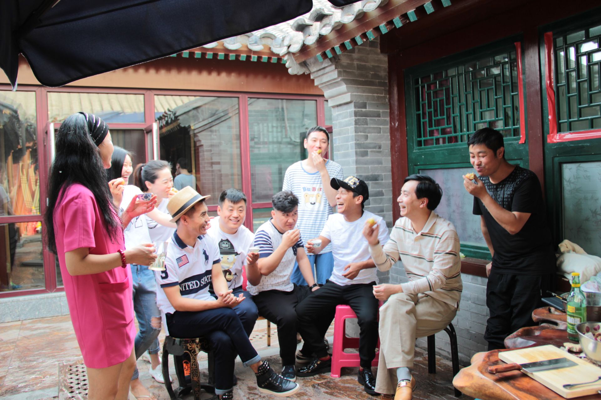照片说明:刘双平(右二)与“刘老根大舞台”演员们在一起交流