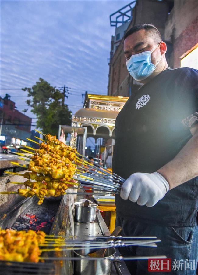 2022年4月18日傍晚,玉苏普江在烤羊肉串。(极目新闻记者 黄志刚 摄)