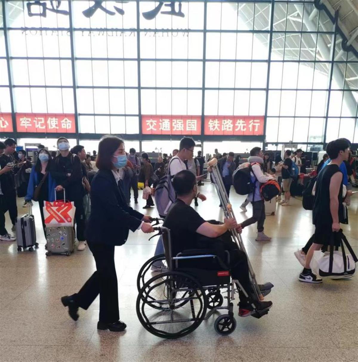 5月1日下午3时左右,专班人员接到12306重点旅客工单预约服务:一名腿脚不便的旅客要乘坐到上海虹桥的列车,需要提供轮椅帮扶进站。工作人员提前打电话联系旅客,提前在东进站口等候,为旅客开启人工通道,护送旅客进站检票,并送上列车。这是武汉火车站站区办开展的一项文明接驳服务。据统计,小长假期间,文明接驳专班累计帮扶重点旅客进出站60余次。