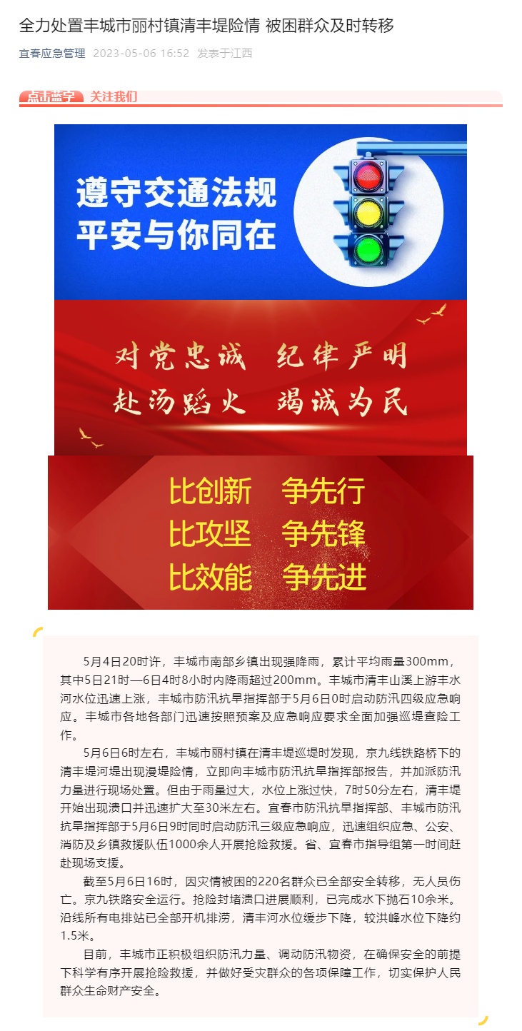 5月6日6时左右,丰城市丽村镇在清丰堤巡堤时发现,京九线铁路桥下的清丰堤河堤出现漫堤险情,立即向丰城市防汛抗旱指挥部报告,并加派防汛力量进行现场处置。但由于雨量过大,水位上涨过快,7时50分左右,清丰堤开始出现溃口并迅速扩大至30米左右。宜春市防汛抗旱指挥部、丰城市防汛抗旱指挥部于5月6日9时同时启动防汛三级应急响应,迅速组织应急、公安、消防及乡镇救援队伍1000余人开展抢险救援。省、宜春市指导组第一时间赶赴现场支援。