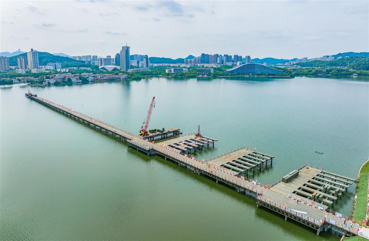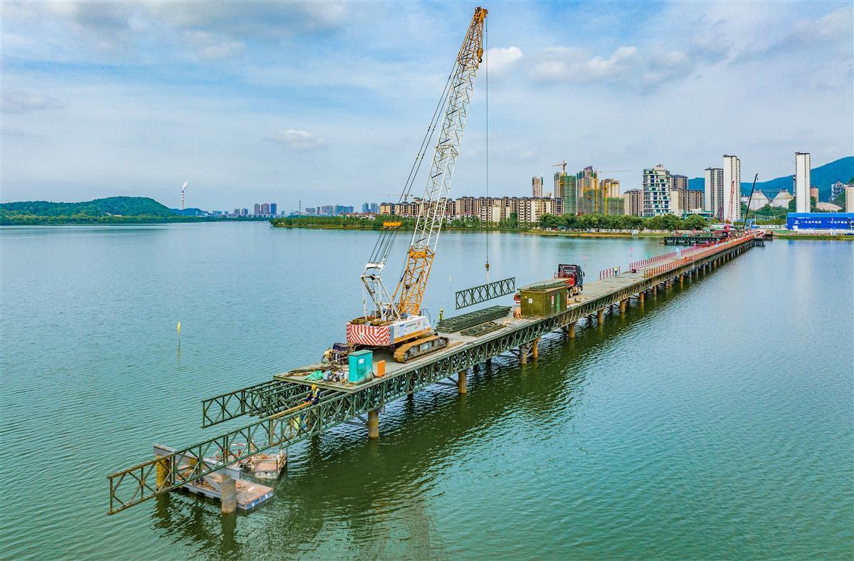 5月5日,黄石磁湖大桥项目施工人员正在搭设钢栈桥。目前,钢栈桥主栈桥施工已完成60%。该项目全长约1.5公里,计划总投资5.6亿元,大桥采用葵花拱桥,连续17孔结构,线性优美。大桥建成后,将极大改善环磁湖周边居民交通出行状况,带动环磁湖旅游发展。