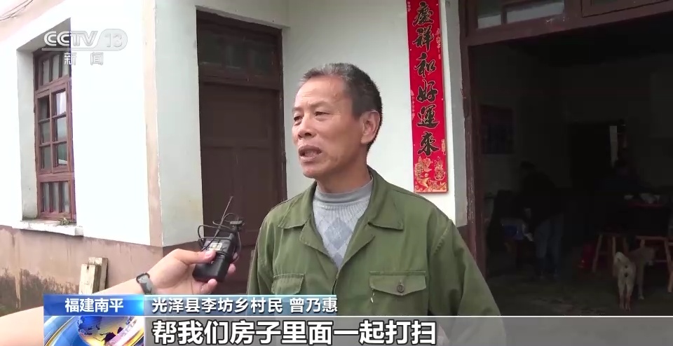 光泽县李坊乡村民 曾乃惠:消防人员7点多就到我们桥头集合了,冲这些垃圾,帮我们一起打扫房子里面,我们很感动,很高兴。