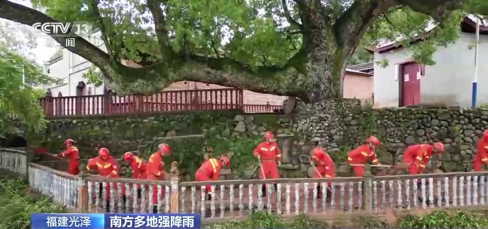 7日上午,在福建南平光泽县李坊乡,消防人员忙着清理河道和路面。