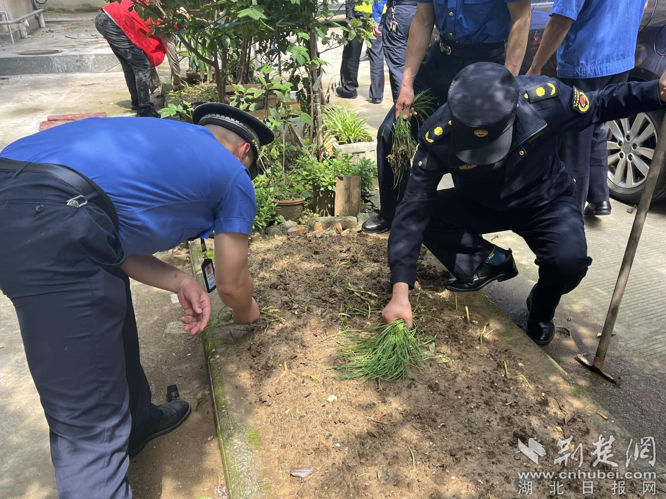 绿化带内,不少居民在其中种植观赏性植物和蔬菜,执法人员和志愿者仔细辨别,小心铲除蔬菜,同时不断向周边群众宣传:“公共绿地属于公共所有或集体、小区业主共有,不能私自占用小区绿化种菜。”不少居民表示支持和理解,有的自发铲除菜地,有的由执法人员将蔬菜铲出,居民带回家中。随后,志愿者向铲过的土地播撒格桑花种,并在上面覆盖一层薄土,号召周围居民共同维护小花园,做好后续养护,为小区新添一抹亮色。