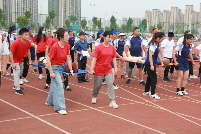 运动会有女子摸石过河15米、男子背急救包100米、2男2女混合担架病人转运100米、5男5女混合一圈到底、男子4*100米输液袋接力比赛、10男10女混合拔河比赛6个项目。大家发挥团队精神,有的队员跑步时摔倒了爬起来继续完成比赛。大家迸发出团结、向上的激情,不畏困难,勇于争先。赛场上是队员们努力奔跑的虎虎身姿,还有一个又一个在合力拼搏中凝聚力量、携手共进的团队身影。在这个欢乐的大家庭里,大家全身心投入到比赛中,加油声此起彼伏,欢笑声在耳边回荡。