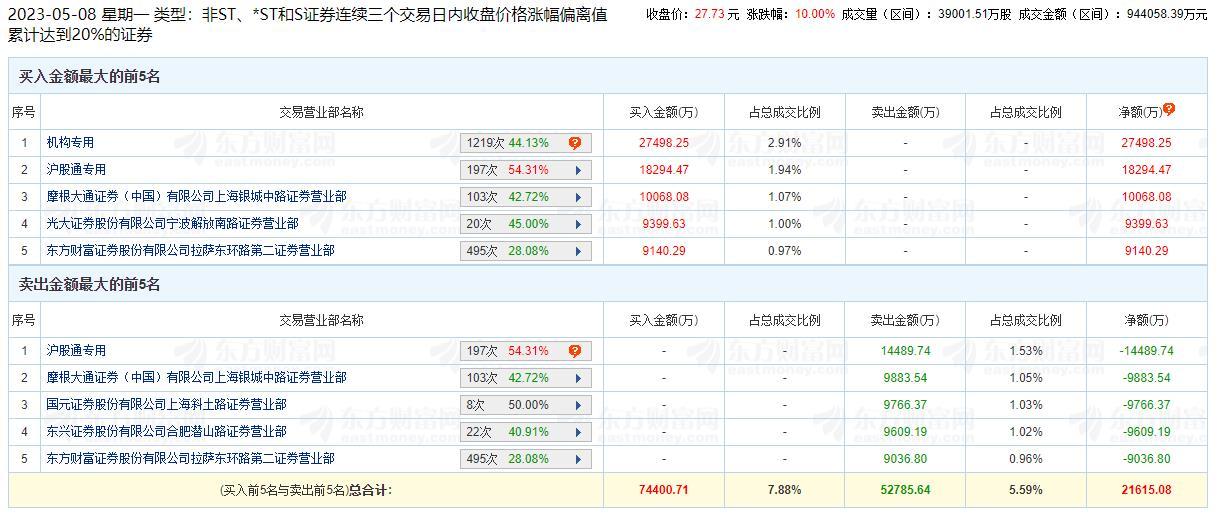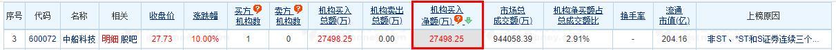 龙虎榜数据显示,作为非ST、*ST和S证券连续三个交易日内收盘价格涨幅偏离值累计达到20%的证券,买入中船科技金额最大的前五名中,有1家机构专用席位。经统计,中船科技的机构席位三个交易日净买入金额为27498.25万元。